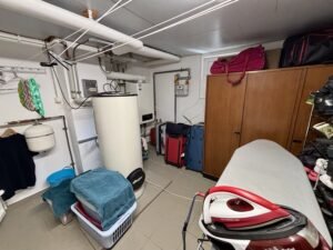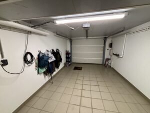 Depuis le hall d'entrée en au rez-de-chaussée, un escalier permet d'accéder au sous-sol de la maison, compose d'un garage (pour deux voitures, avec porte motorisée et prise électrique pouvant servir à la recharge d'une voiture), une chaufferie/buanderie et une cave à provisions.