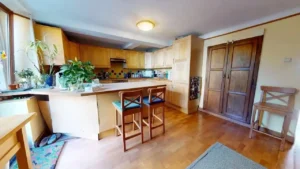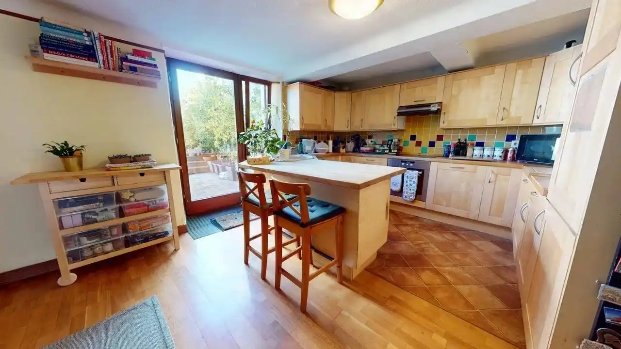 - Cuisine ouverte équipée (environ 18 m²) avec accès direct au jardin